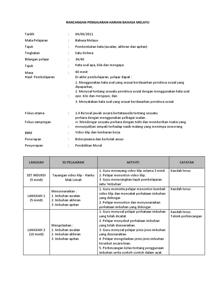 Rancangan Pengajaran Harian Bahasa Melayu Tingkatan 1 Pdf